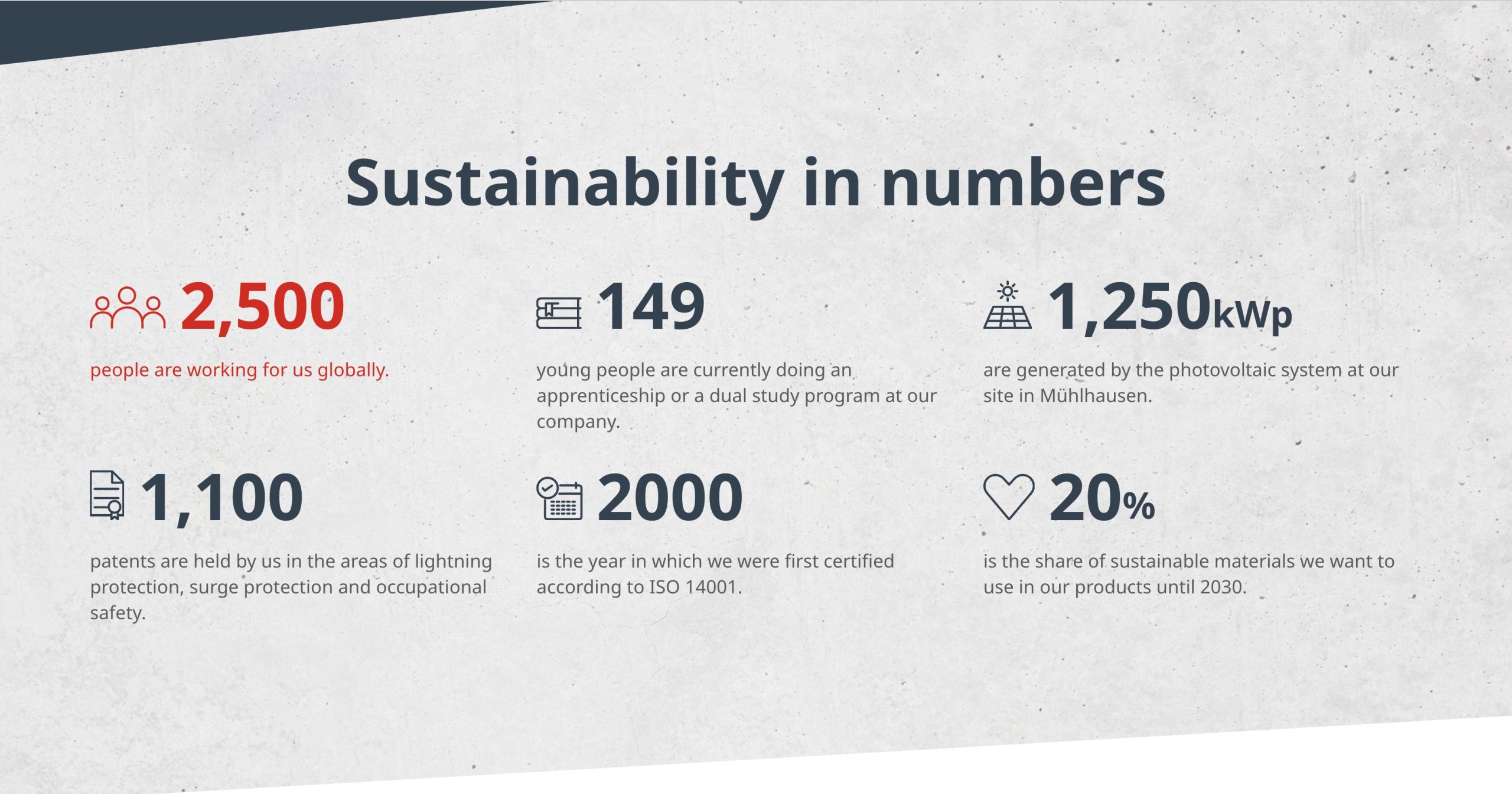 Prima della pubblicazione del suo primo rapporto di sostenibilità, DEHN aveva già adottato numerose misure a favore della sostenibilità, ora confluite in una strategia strutturata a livello di gruppo. La nuova strategia si articola in quattro aree centrali di azione: gestione aziendale responsabile, ruolo come datore di lavoro, responsabilità sui prodotti e servizi, impegno per l’ambiente.