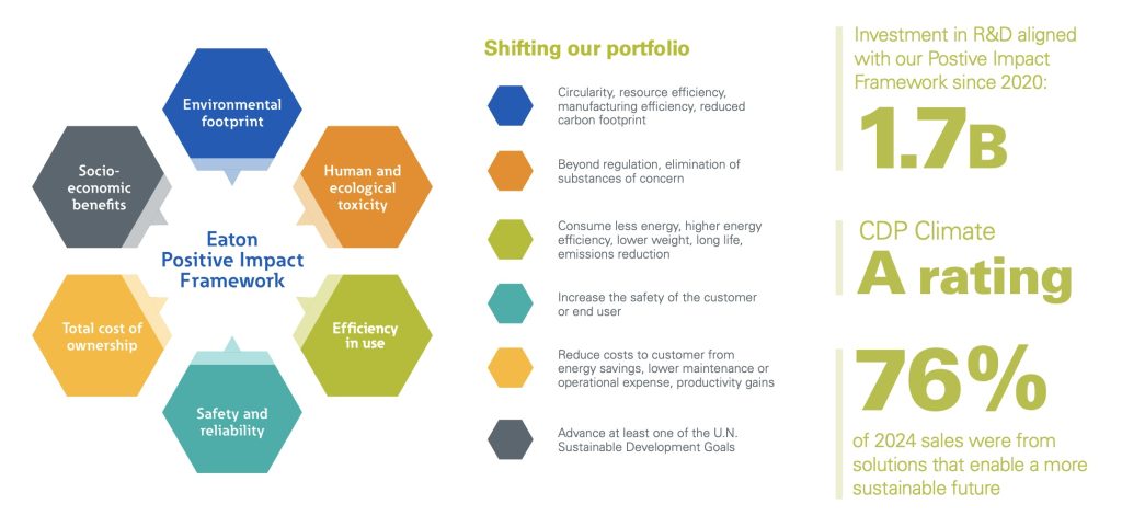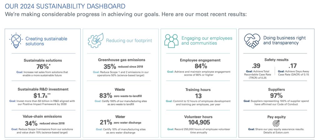 Gli obiettivi Eaton sono stati approvati dall’iniziativa Science Based Targets, allineandosi agli scenari per contenere le temperature entro 1,5°. Dal 2018, l’azienda ha ridotto le emissioni del 35%, superando obiettivi intermedi. L’83% degli stabilimenti ha ottenuto la certificazione zero rifiuti in discarica, mentre il 21% ha raggiunto zero scarichi idrici.